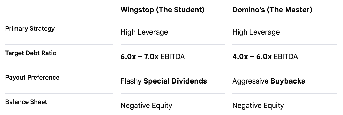 There is one stand-out peer that has a structurally similar business model, Domino’s. Both focus on quality, speed, and take-out and rely on a heavily franchised, asset-light model designed for efficiency and not so much dine-in. Domino’s also does a similar thing, mortgaging its brand to pay dividends and buy back stock, pioneering the method called “Whole Business Securitization,” which I would encourage you to research more because it is a little hard to explain in this research report.